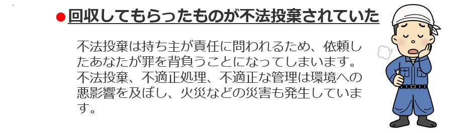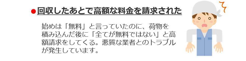 不用品回収業者に依頼する際に最も注意しなければいけないことが違法業者の存在です。特に以下の方法で無料や格安で回収と謳っている業者は廃棄物の収集や処分を「無許可」で行う業者で違法である可能性が高いといえます。