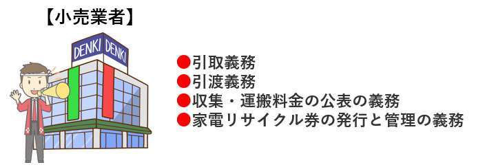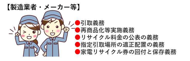 家電リサイクル法は、正式には特定家庭用機器再商品化法と呼ばれ、以下の要件が義務づけられています。